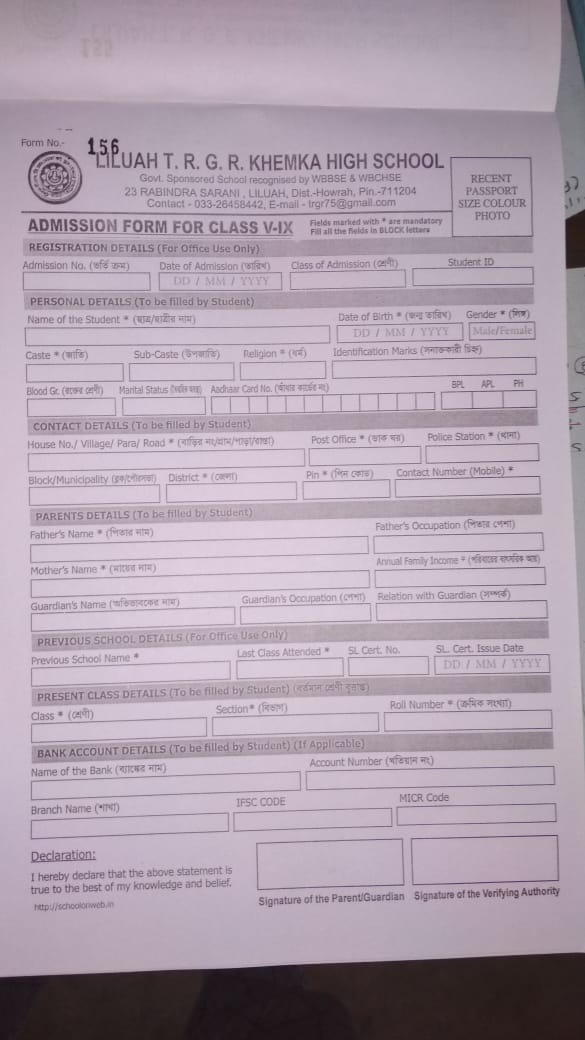 Admission Form for Class V to IX - Download