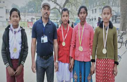 Students after receiving medal in zonal sports with sports teacher
