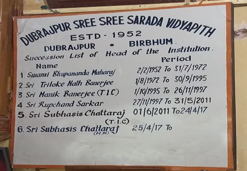 Dubrajpur Sree Sree Sarada Vidyapith is one of the glorious institutions in the district of Birbhum. It was set up in the year 1952 and organised by Sree Sree Ramkrishna Ashram, Dubrajpur. The school is directed by the Department of School Education, Government of West Bengal. As a school of Dubrajpur Circle, it is controlled by