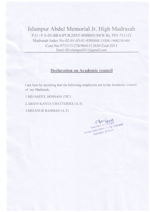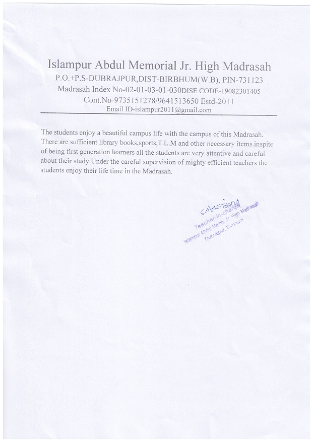 Islampur Abdul Memorial Jr High Madrasah is the only one Madrasah in Dubrajpur Municipalty. It is started it's journey on 27th of july in 2011 in a room at Islampur Abdul Memorial Primary School. After few years a new madrasah building was estabilished in a land donated by Dubrajpur Municipality and four teachers of this madrasah. Since the very first day the madrasah is del