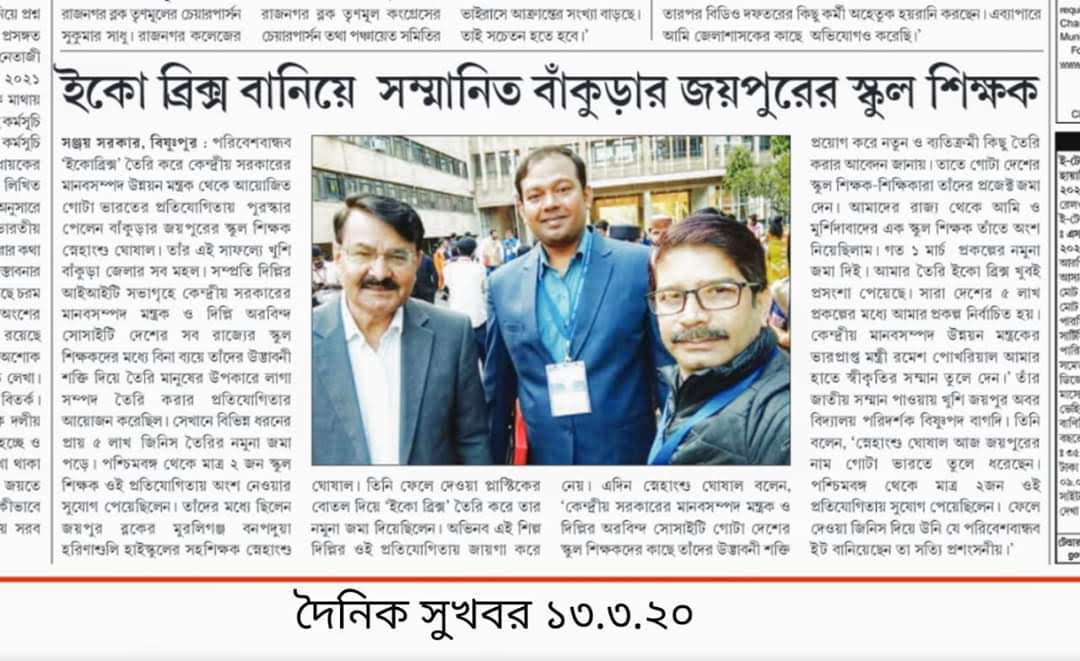NATIONAL LEVEL AWARD FROM HONOURABLE MHRD MINISTER FOR ECOBRICKS PROJECT AT IIT,DELHI