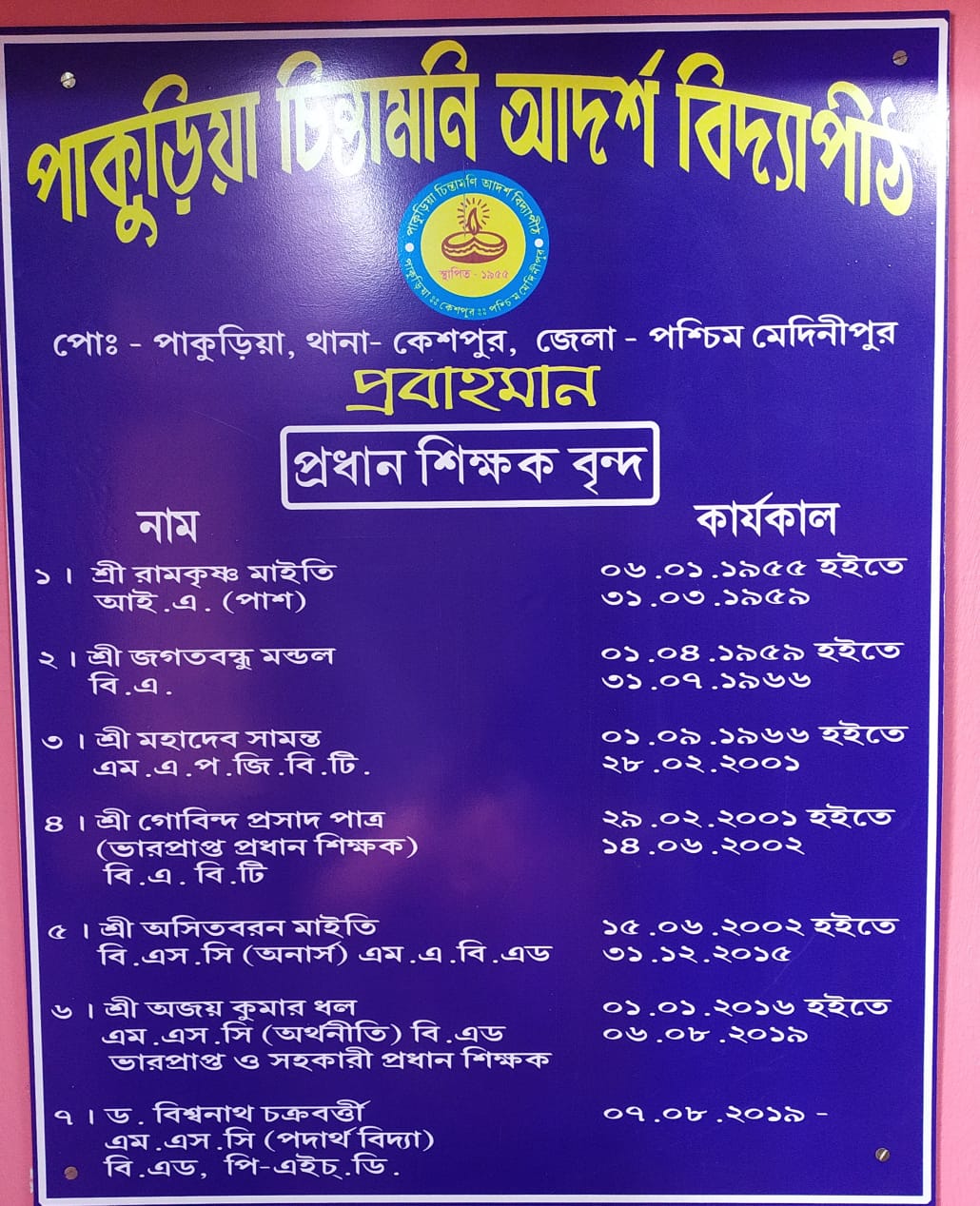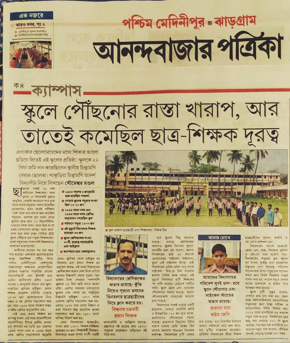 An earthen lamp of education was first ignited by a torch bearer,veteran educationist Mr. Binod Bihari Bera, keshpur , the then Medinipur district in the form of M.E. School established on 1st January,1949. Now it is Pakuria Chintamoni Adarsha Vidyapith(H.S) . Mr. B.B. Bera’s lamp is still radiating the rays in the forms of quality education & good characters.