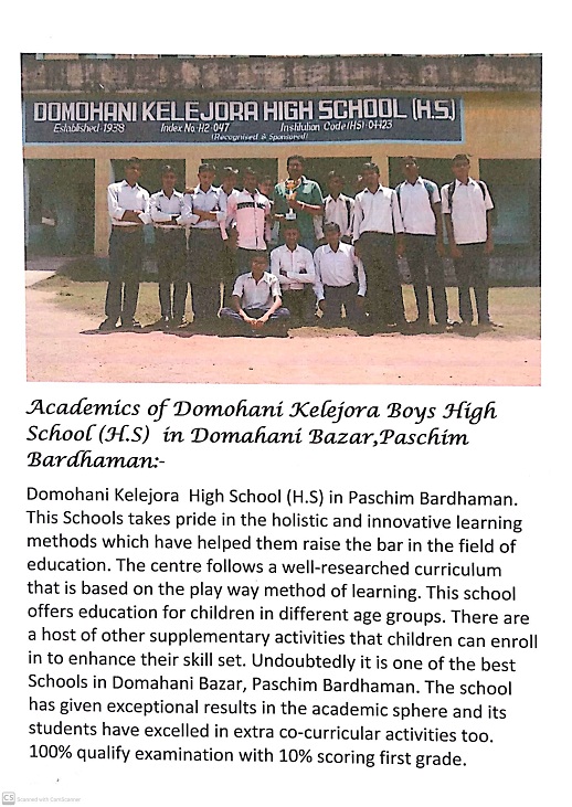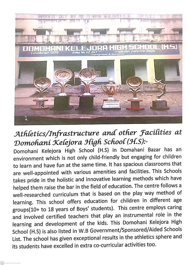 Domohani Kelejora High School (H.S) runs in a government school building. The school has 25 classrooms, computer facility, scientific laboratory fa