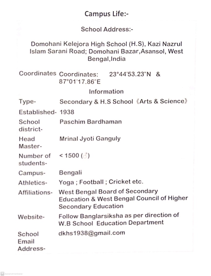 Domohani Kelejora High School (H.S)-[DKHS] is a Bengali medium school in Domohani Bazar, Asansol, West Bengal, India, established in 1938. The headmaster of the school is Mrinal Jyoti Ganguly.