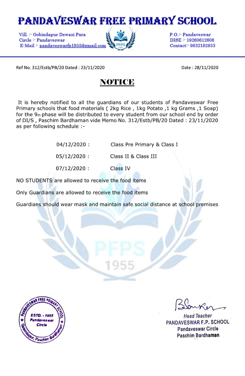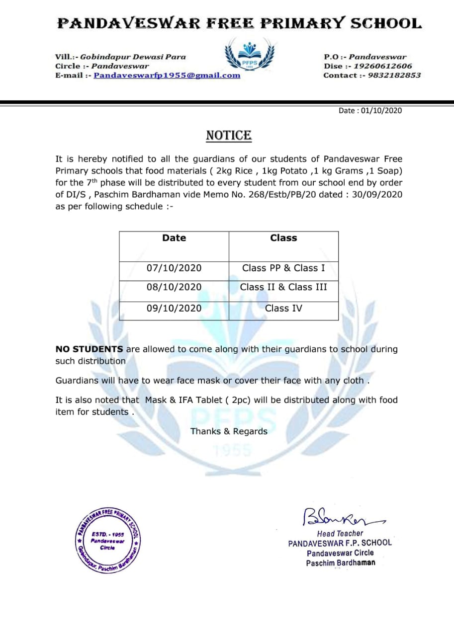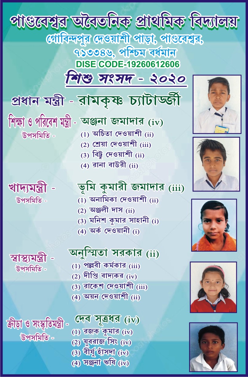 Pandaveswar free primary School is an elementary school for class Pre Primary to class IV . The school is saituated at Gobindapur Dewasi Para , P.O + P.S – Pandaveswar , Dist.- Paschim Bardhaman . The school has 82 students ( academic year 2021) and 4 teachers including head Teacher and a para teacher . The teachers are very efficient and hard working .We obtain online classes dur