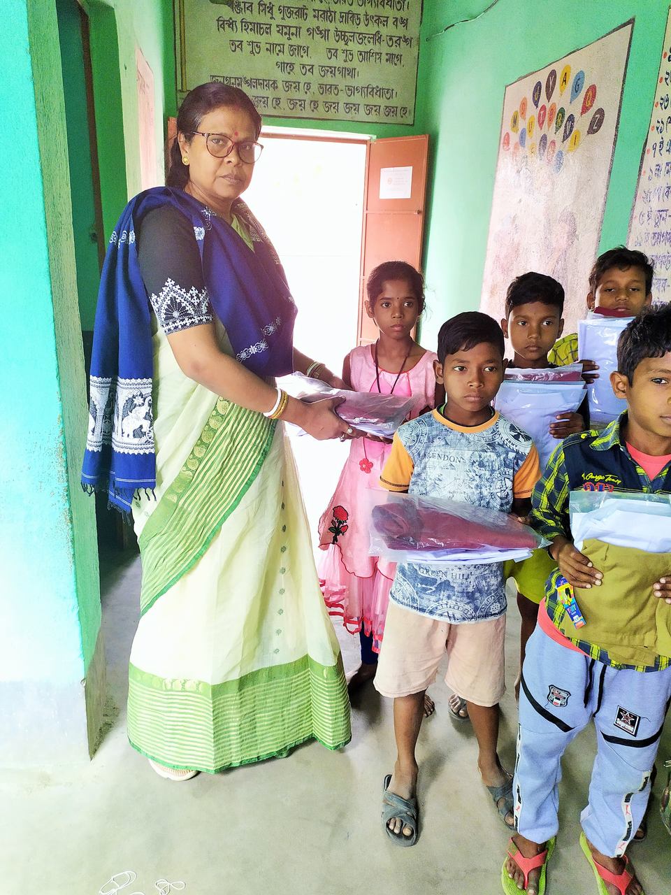 TIC Mrs. Radha Banerjee is distributing Student Uniforms.